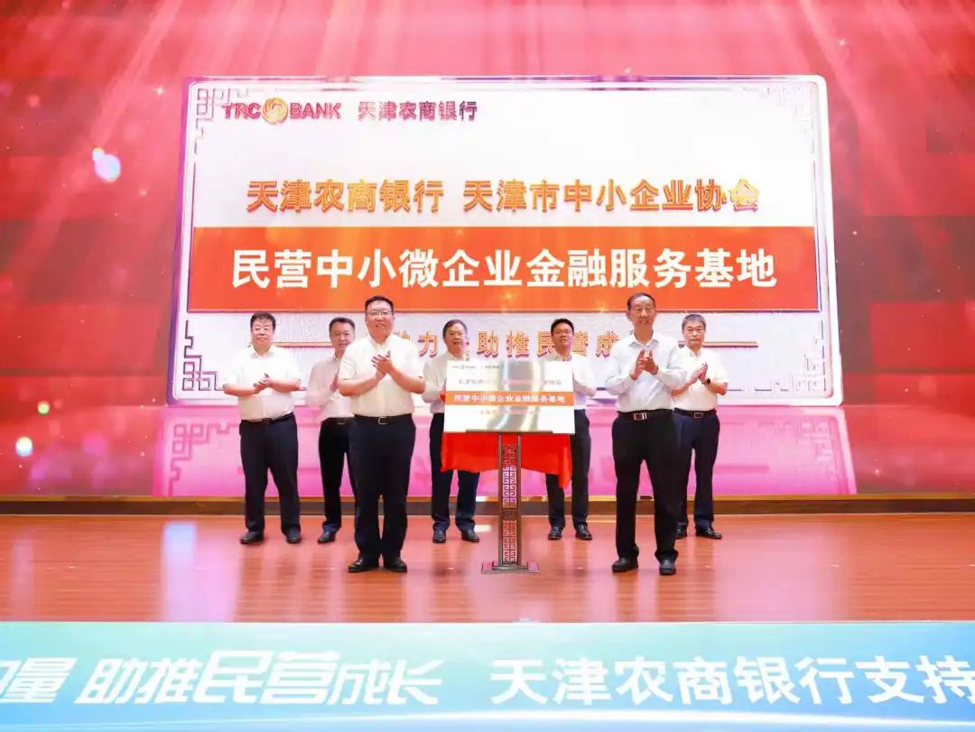会上,天津市中小企业协会与天津农商银行共同建立“民营中小微企业金融服务基地”,中小企业协会会长郭宝印和农商银行行长杨毅共同为基地揭牌。基地将作为民营中小微企业的金融服务之家,不断加大中小民营经济支持力度,为中小民营企业提供更多优质金融服务。